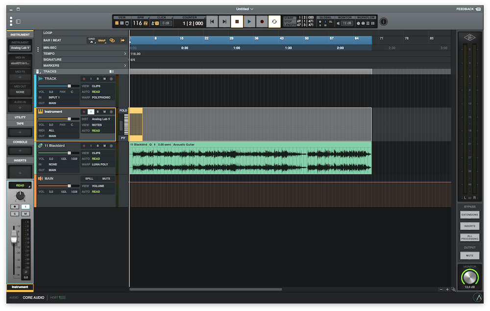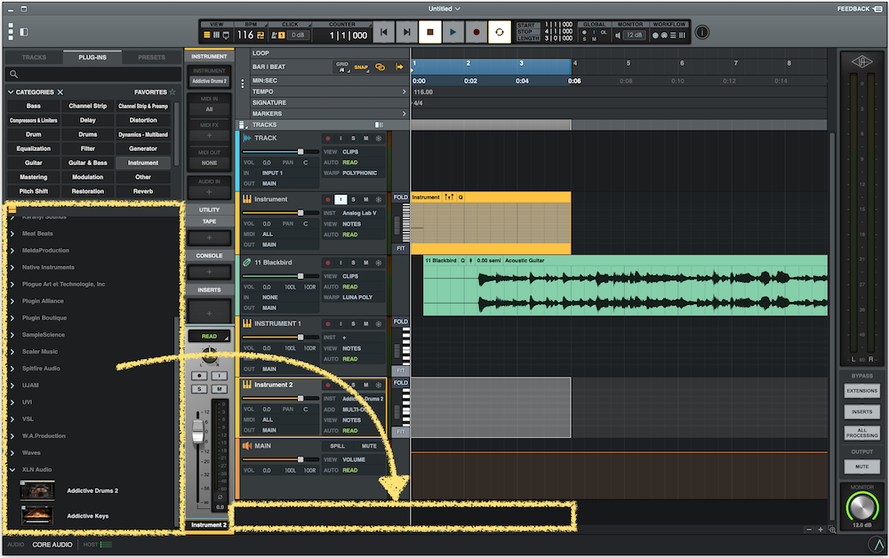ちなみにうちの環境では、インストゥルメンタルリストから空いている場所へドラッグ&ドロップで音源が差し込まれたトラックが追加されましたのでお試しあれ!
