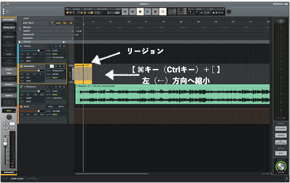 当然ですが【E】と【 ⌘キー(Ctrlキー)+ ] 】の組み合わせでリージョンを目一杯拡大することが出来ます(その逆も然り)